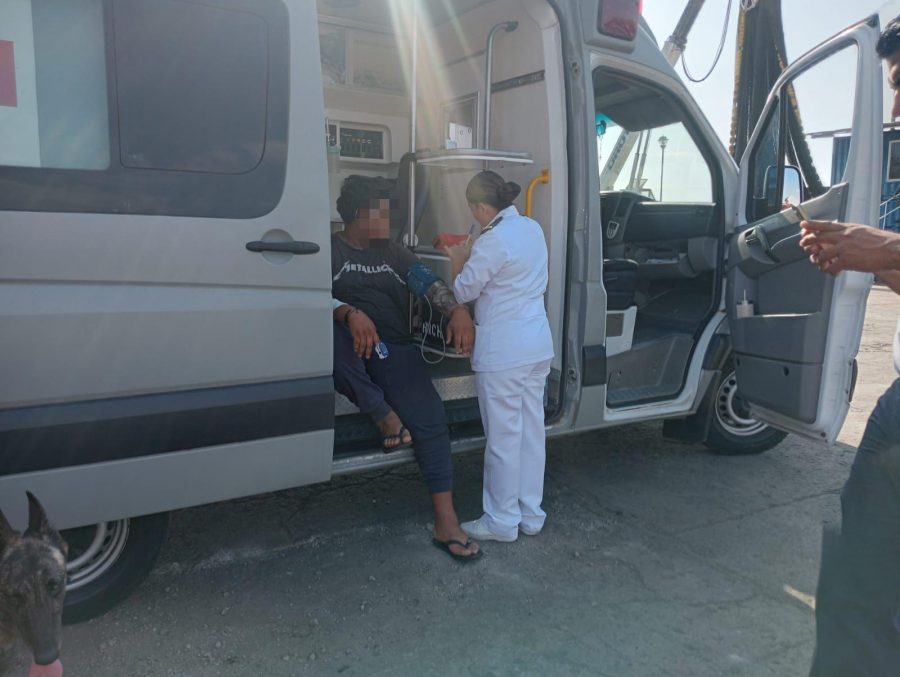 Los tripulantes fueron rescatados de forma segura por el buque Nair y trasladados al muelle de Puerto Chiapas, donde personal de Sanidad Naval realizó evaluaciones médicas.