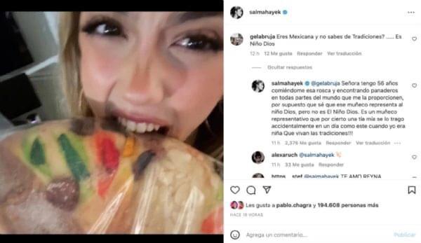“Eres mexicana y no sabes de tradiciones? Es Niño Dios”, fue uno de los comentarios a los que Salma Hayek no dudó en responder: “Señora, tengo 56 años comiéndome esa rosca y encontrando panaderos en todas partes del mundo que me la proporcionen. Por supuesto que sé que ese muñeco representa al Niño Dios, pero no es el Niño Dios. Es un muñeco representativo que, por cierto, una tía mía se lo tragó accidentalmente en un día como éste cuando yo era niña. ¡Qué vivan las tradiciones!”.