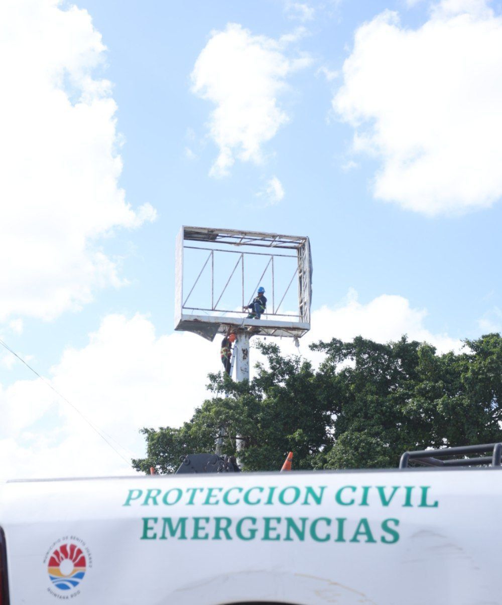 “Hemos solicitado el apoyo de SMIE que son los expertos en estructuras para que hagan un dictamen en conjunto con Protección Civil y conocer cuales representan un riesgo para la seguridad de las y los cancunenses”, afirmó la Alcaldesa al constatar las acciones realizadas para salvaguardar la seguridad la ciudadanía.