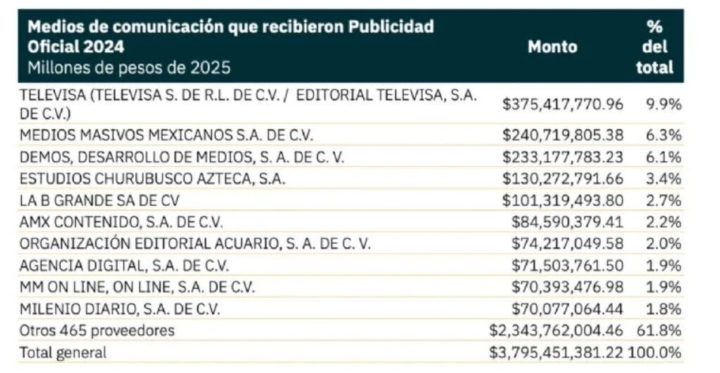 El reportaje señala que Televisa fue la empresa más beneficiada, al recibir mil 877 millones de pesos durante el sexenio, seguida de TV Azteca, propiedad de Ricardo Salinas Pliego, y La Jornada, medio históricamente cercano a la llamada Cuarta Transformación.