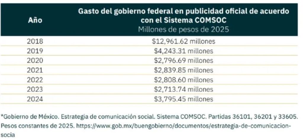 No obstante, el análisis indica que la disminución no implicó una mayor equidad en la distribución. Las diez dependencias federales con más gasto concentraron 2 mil 995 millones de pesos, casi el 80% del total invertido en comunicación social.