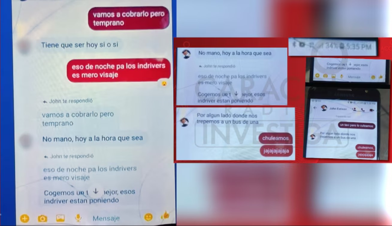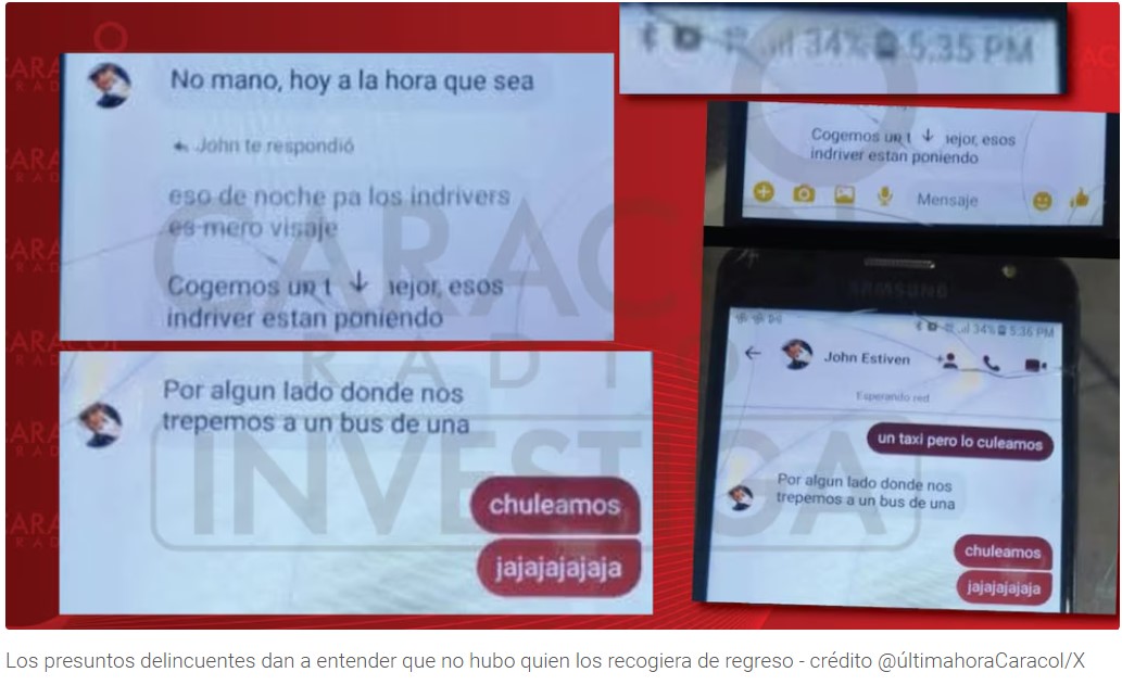 Según los reportes, los atacantes se habrían movilizado inicialmente en motocicleta y después discutieron la forma de escapar tras ejecutar el ataque: “Cogemos un bus mejor, esos indriver están poniendo”, dice uno de los mensajes, seguido por la respuesta: “Chuleamos jajajaja (…) Un taxi pero lo culeamos”.
