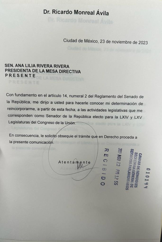 Ciudad de México (Marcrix Noticias).- De manera sorpresiva, el senador Ricardo Monreal Ávila notificó este jueves a la Mesa Directiva su reincorporación al Senado de la República, luego de haber solicitado licencia para buscar la coordinación nacional de Morena.