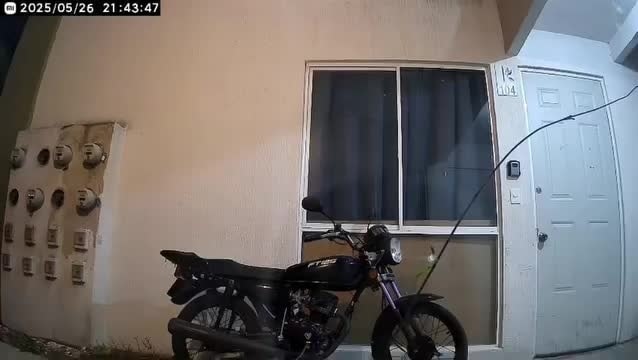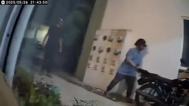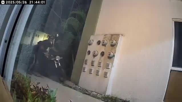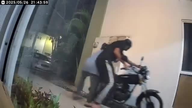 Se puede observar a uno de los ladrones que verifica si la motocicleta tenía seguro o no y después llega su compañero y entre los dos sacan la moto del pasillo de la residencial sin arrancarla.