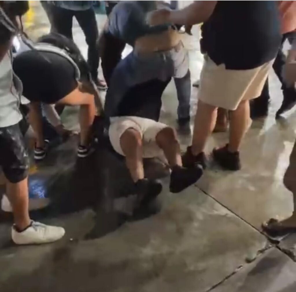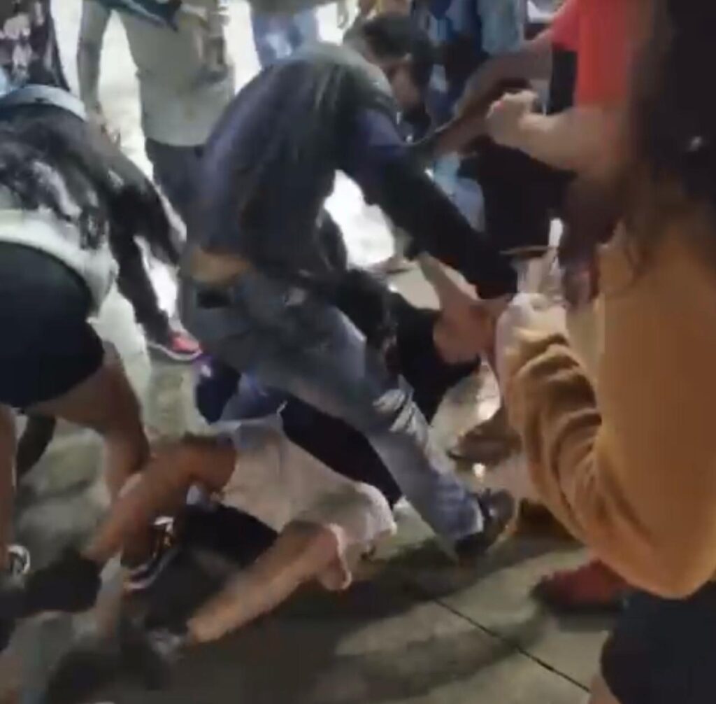 Testigos señalaron que todo comenzó cuando una joven, vestida con sudadera, atacó a otra mujer embarazada y dos personas que presenciaron la agresión intervinieron para defender a la víctima, pero rápidamente fueron atacadas por el grupo de motociclistas.