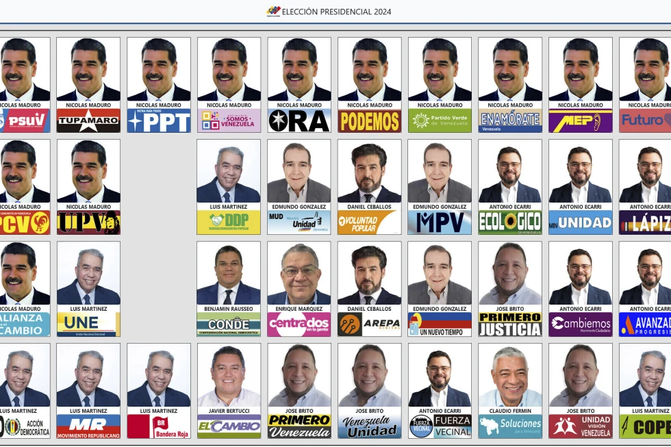 Las reglas electorales de Venezuela permiten que las fotografías de los candidatos aparezcan en las boletas —las electrónicas dentro de Venezuela y las impresas para quienes votan en el extranjero— tantas veces como el número de partidos que las apoyan. La boleta de este año tiene 38 fotografías, cada una con el nombre y el partido de cada candidato debajo.