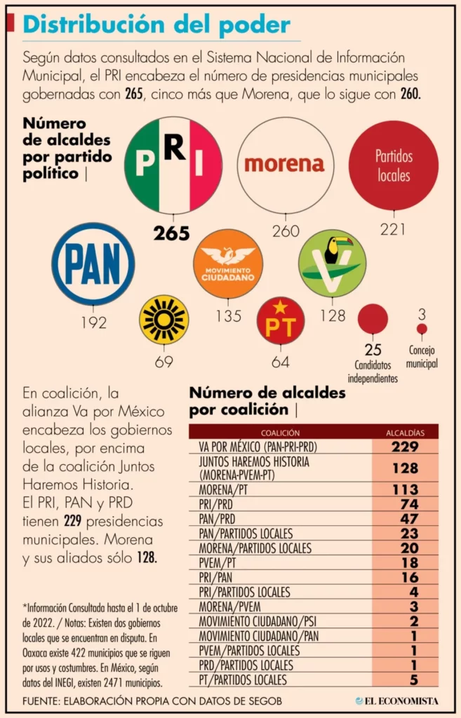 En la actualidad, el PRI es la primera fuerza política a nivel municipal, ya que cuenta con 265 alcaldes en todo el país, según un recuento realizado por El Economista con datos de la Secretaría de Gobernación.