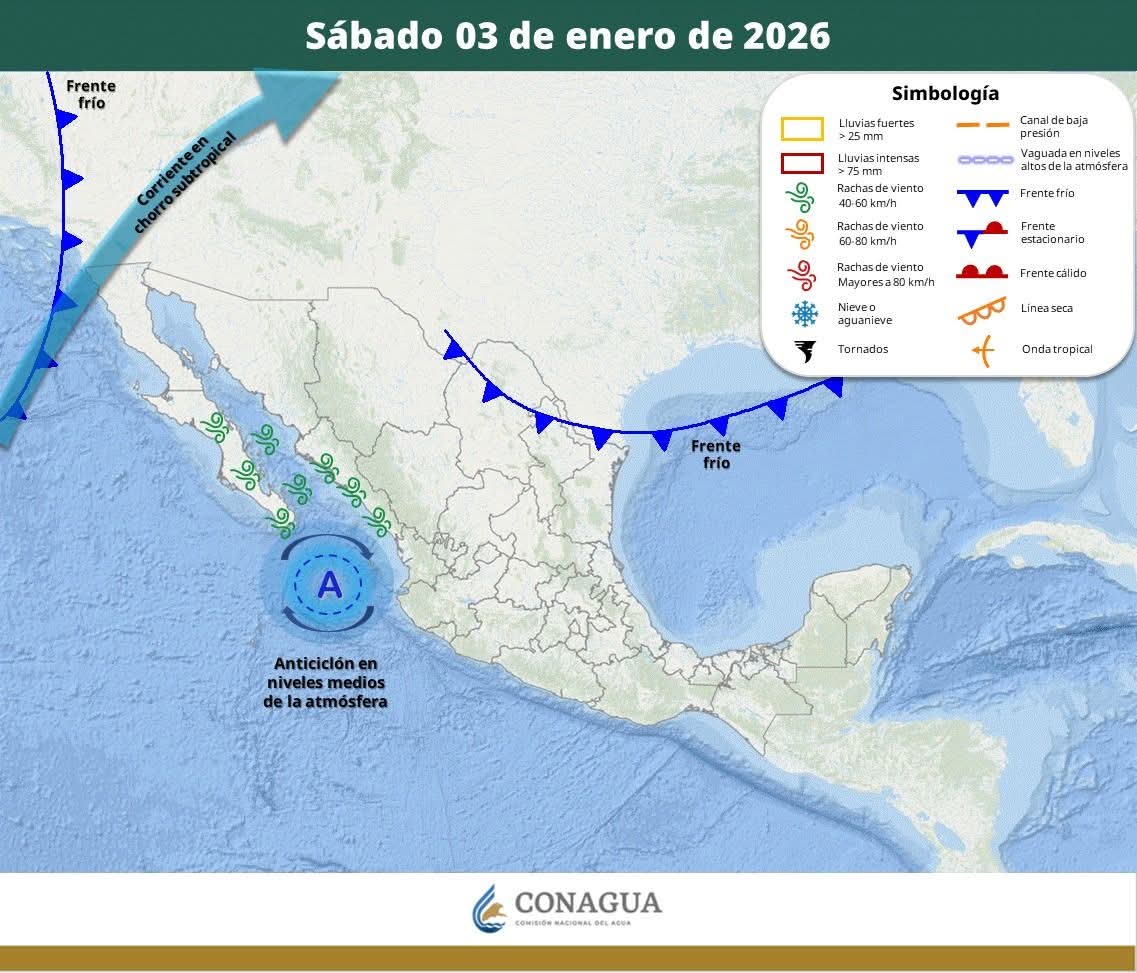 A nivel nacional, el SMN informó que el ingreso de humedad del Océano Pacífico provocará lluvias y chubascos en regiones del occidente, sur y sureste del país, mientras que un nuevo frente frío ingresará al norte y noreste de México, generando descenso de temperaturas y vientos fuertes.