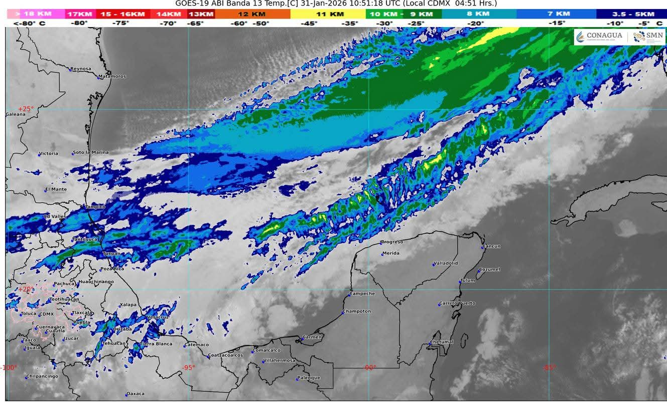 Cancún(Marcrix Noticias).- El desplazamiento del Frente Frío número Treinta y dos sobre la Península de Yucatán, originará cielo parcialmente nublado a nublado, lluvias con intervalos de chubascos. La masa de aire ártico asociada al frente, propiciará evento de “Norte” muy fuerte con rachas de 60 a 80 km/h sobre las zonas de costa, principalmente sobre los municipios del norte del estado con oleaje elevado de 3 a 4 metros de altura, así como un descenso de las temperaturas con ambiente templado durante el día y fresco a frío por la madrugada y al amanecer. Se prevé bancos de niebla en tramos carretero, zonas rurales y urbanas del estado.