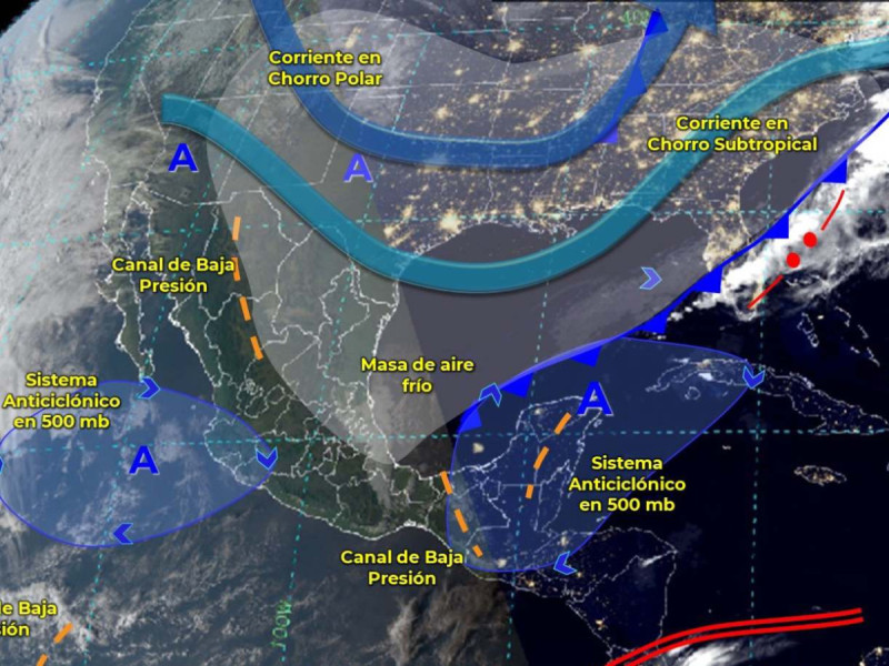 Además la masa de aire frío continuará generando ambiente matutino y nocturno frío a muy frío sobre la Mesa del Norte, la Mesa Central, el noroeste y oriente del territorio nacional, con heladas al amanecer, así como densos bancos de niebla en la Sierra Madre Oriental.