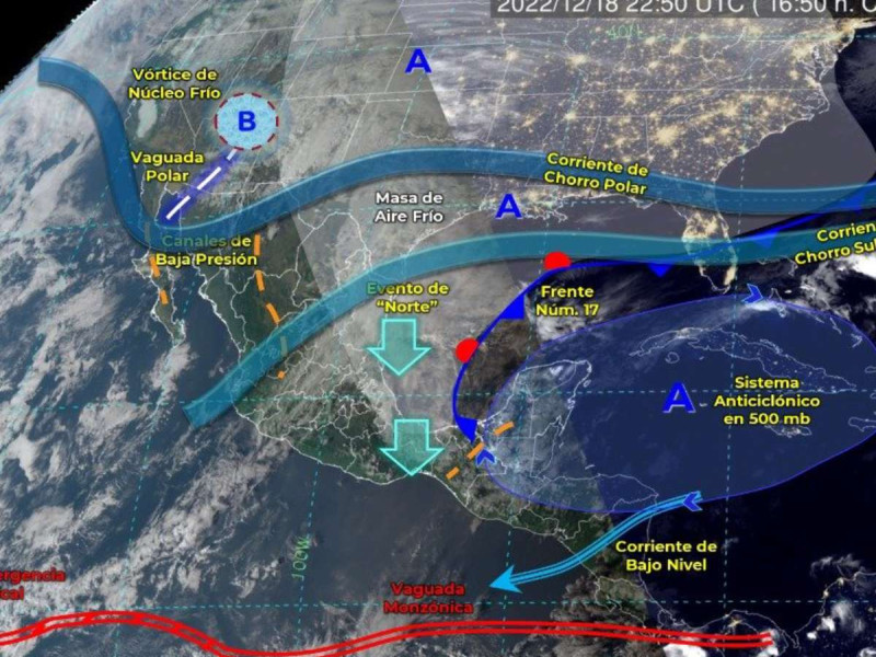 El frente frío número 17 se localizará sobre el centro del Golfo de México e interaccionará con un canal de baja presión sobre el sur del golfo, ocasionando lluvias y chubascos sobre el oriente y sureste del país.