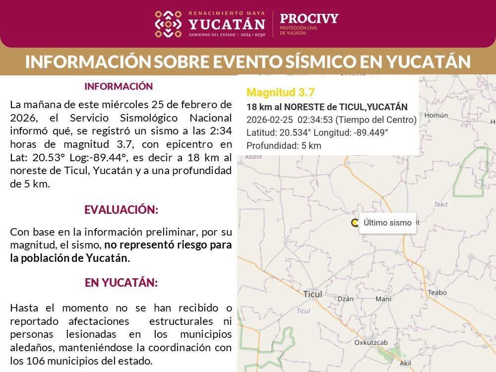 Un sismo de magnitud 3.7 se registró la madrugada de este miércoles en el sur de Yucatán, sin que se reportaran daños ni personas lesionadas.