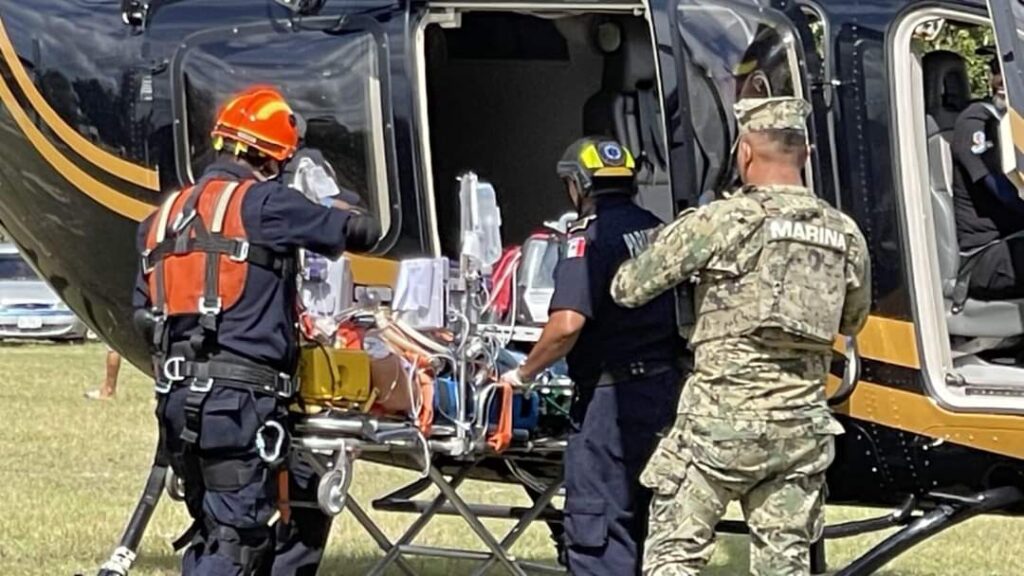 Personal del Ejército Mexicano solicitó la presencia del helicóptero Bell 429 de la Seguridad Publica de Yucatán por la condición crítica de salud de los marinos heridos de gravedad.