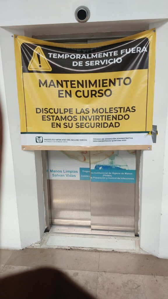 Mientras el Instituto del Seguro Social (IMSS) reporta la conclusión de reparaciones en el Hospital General Regional No. 17 de Cancún, usuarios en redes sociales denuncian que el elevador aún está fuera de servicio.