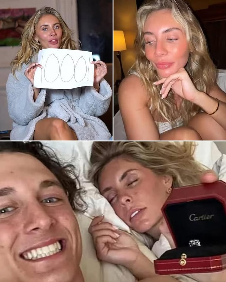 En la imagen, se le ve sosteniendo un anillo de compromiso mientras Bonnie Blue, de 25 años, aparece dormida en el fondo.