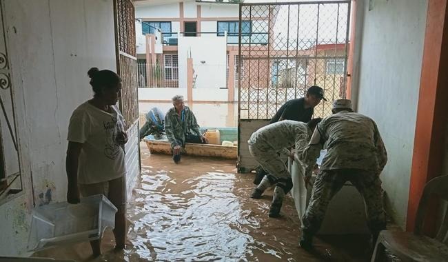 En los municipios de Las Choapas y Coatzacoalcos, donde también resultaron afectadas varias colonias, integrantes de esta institución ayudan en la evacuación de familias y retiran muebles y electrodomésticos que resultaron dañados por las inundaciones.