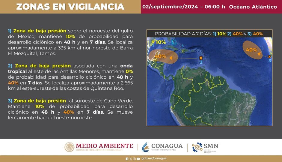 Chetumal (Marcrix Noticias)- La zona de baja presión sobre el noroeste del golfo de México, mantiene 10% de probabilidad para desarrollo ciclónico en 48 h y en 7 días.