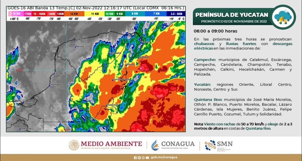 En las próximas tres horas se pronostican #Chubascos y #Lluvias puntuales fuertes, además de #Rachas fuertes de #Viento y #Oleaje elevado en entidades de la #PenínsulaDeYucatán.