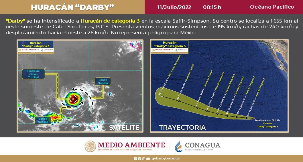 Darby se localizaba a 1.759 kilómetros al suroeste de Cabo San Lucas, en Baja California Sur, y se desplazaba al oeste a 26 kilómetros por hora