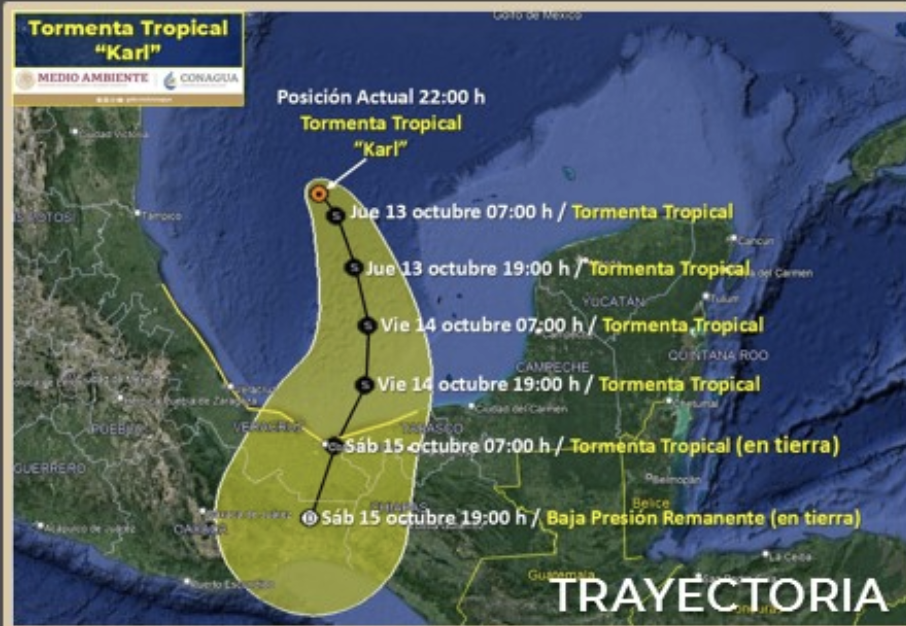 Karl avanzará en los próximos días hacia Veracruz, donde podría tocar tierra este viernes, aunque ya como baja presión remanente, según la proyección del SMN.