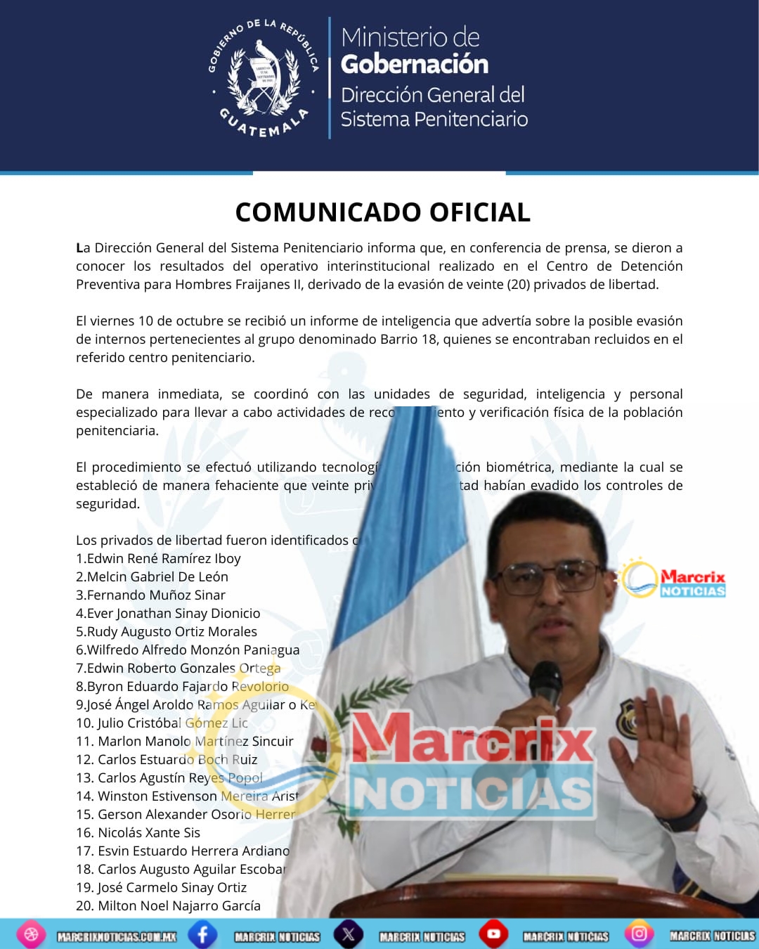 Guatemala. ( Marcrix Noticias).- El 12 de octubre de 2025, veinte miembros de la pandilla Barrio 18 se fugaron de la prisión de Fraijanes II, en Guatemala, en un hecho que ha generado alarma en el sistema de seguridad del país. La fuga se realizó de forma escalonada, uno o dos reos a la vez, aprovechando probablemente las visitas familiares.