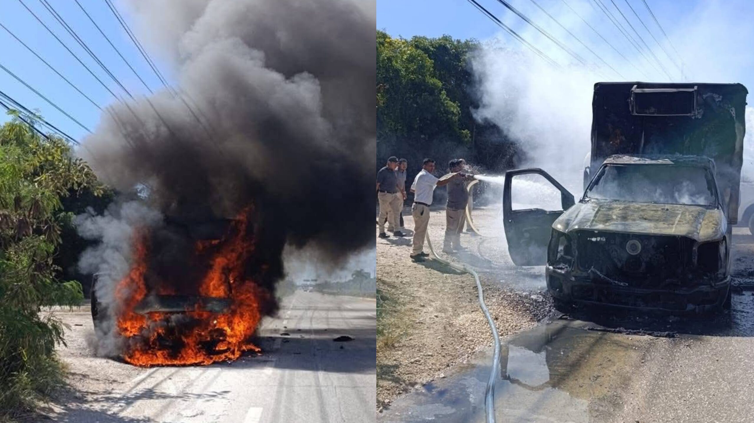 El siniestro se registró poco antes del mediodía, aproximadamente a 12 kilómetros al Norte de Tulum, donde el fuego avanzó rápidamente debido al material del vehículo, provocando una intensa columna de humo visible a varios metros de distancia.