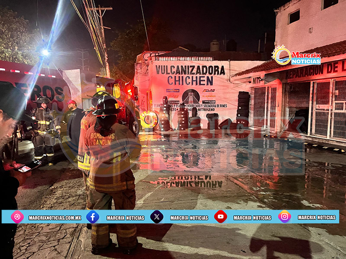 Cancún (Marcrix Noticias).- La noche de este domingo, se registró un incendio en la Vulcanizadora Chichén, la cual se ubica sobre la avenida Chichén Itzá de Cancún.