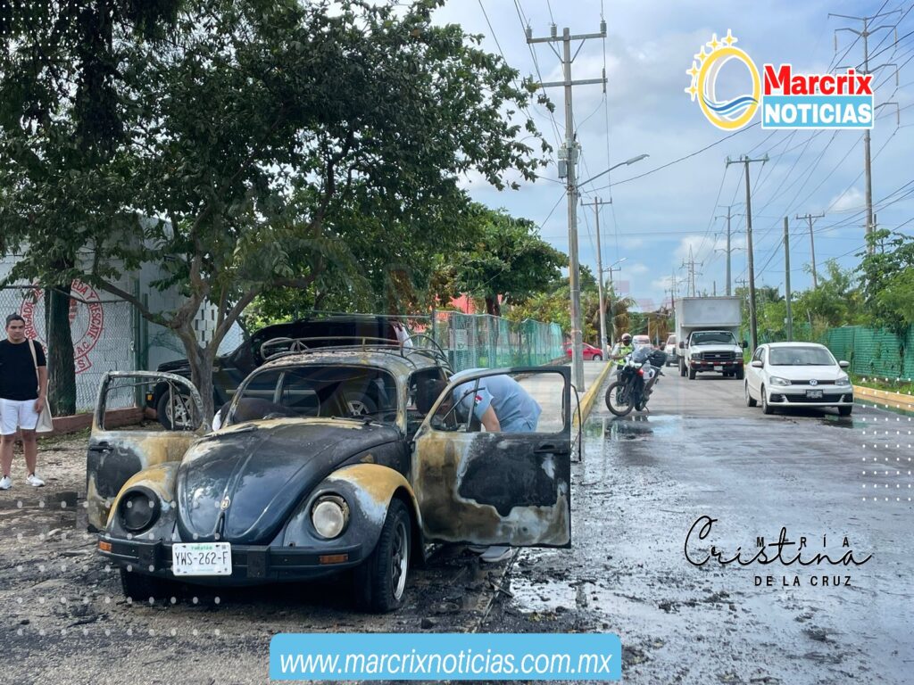 Cancún (Marcrix Noticias).- Un “vochito” quedó casi completamente calcinado tras incendiarse mientras circulaba por la avenida Chac Mol casi esquina con calle 8, en la región 96. No hay lesionados.