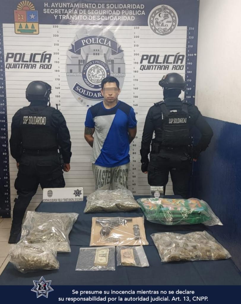 La tarde del 26 de diciembre, fue asegurado Luis “N” de 26 años de edad, originario de esta entidad, en posesión de un arma de fuego, siete cartuchos útiles, 75 envoltorios con posible marihuana y dinero en efectivo en el condominio Coto 7, ubicado en la prolongación de la avenida 38, del fraccionamiento Selvanova.