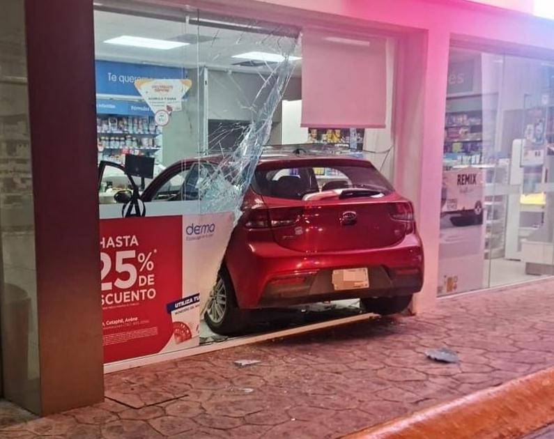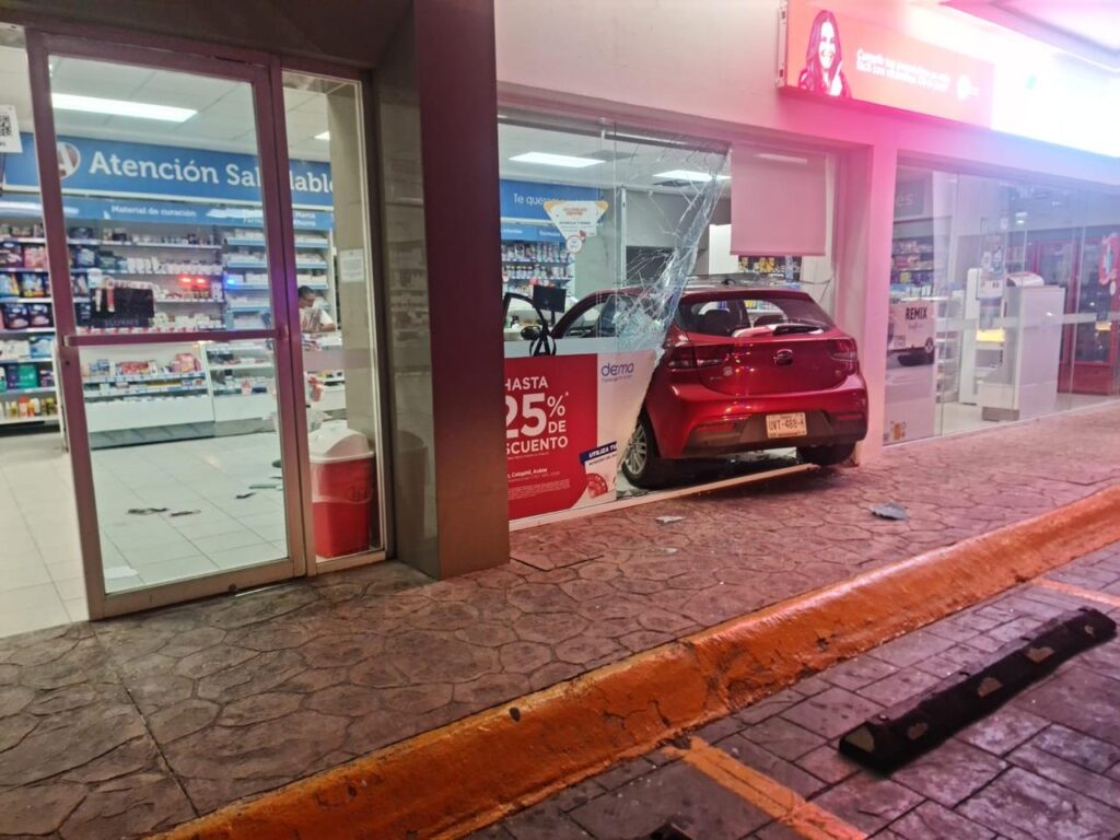 El conductor del vehículo perdió el control y terminó por destrozar una farmacia del Kilómetro 14 de la Zona Hotelera.