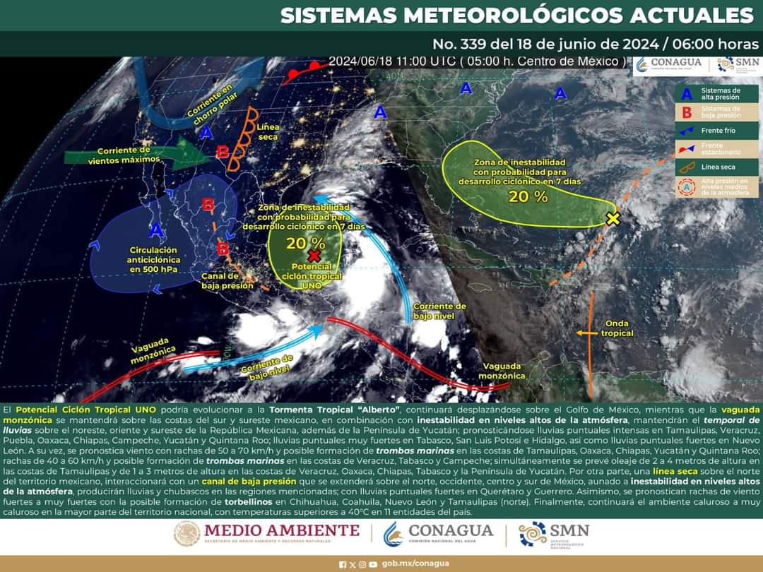 Cancún(Marcrix Noticias.- La Comisión Nacional del Agua-SMNmx informa que durante el transcurso de este martes 18 de junio, el Potencial Ciclón Tropical UNO podría evolucionar a la Tormenta Tropical “Alberto”.