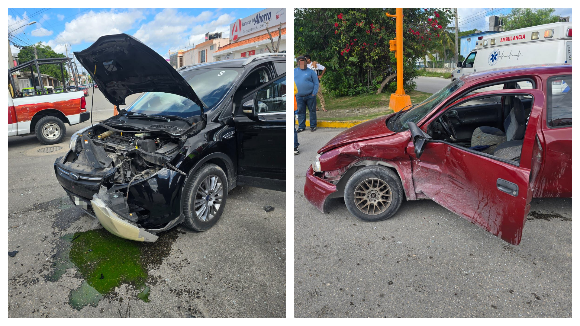 Cancún (Marcrix Noticias).- La mañana de este sábado, a las 11:45 horas, se registró un accidente de tránsito en la Avenida Leona Vicario, en la Supermanzana 217, cuando el conductor de un vehículo Ford Escape negro, al no respetar la luz roja del semáforo, chocó contra un Chevrolet Chevy rojo que circulaba por la calle 31, en dirección norte a sur.