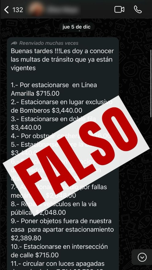 Entre las multas mencionadas en la lista errónea se incluyen cantidades como 715 pesos por estacionarse en una línea amarilla, 3 mil 440 pesos por estacionarse en un lugar exclusivo para bomberos, y 2 mil 389.80 pesos por colocar objetos fuera de una casa para apartar estacionamiento.