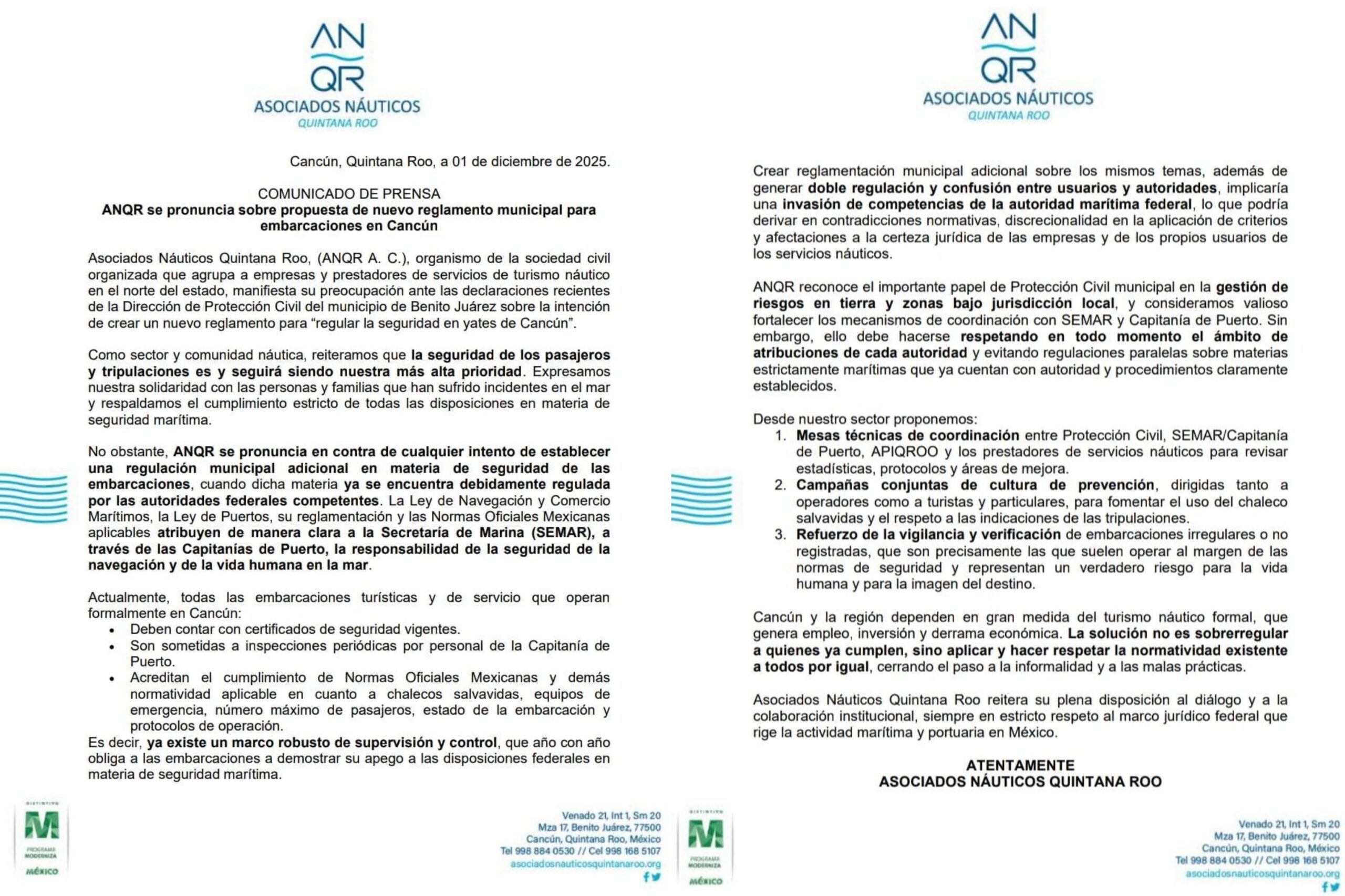 El organismo destacó que la seguridad de pasajeros y tripulaciones es una prioridad para todas las empresas formales del sector, que operan bajo certificaciones, inspecciones periódicas y cumplimiento de Normas Oficiales Mexicanas supervisadas por la Secretaría de Marina (SEMAR) y las Capitanías de Puerto.