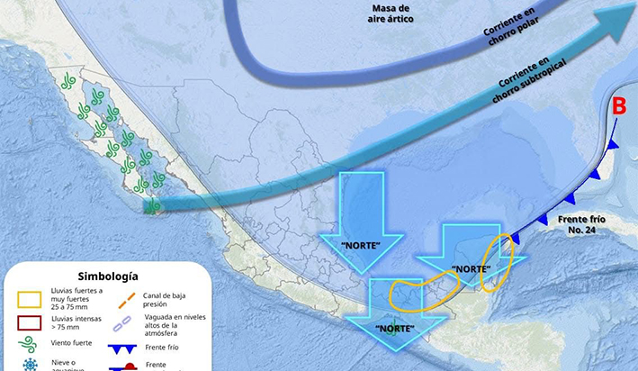 Cancún (Marcrix Noticias).- Debido al reforzamiento de la masa de aire frío qué impulsa al frente frío número 24 y que se mantiene sobre la Península de Yucatán se prevé el incremento del potencial de lluvias fuertes a muy fuertes (50 a 75 mm) sobre Quintana Roo.