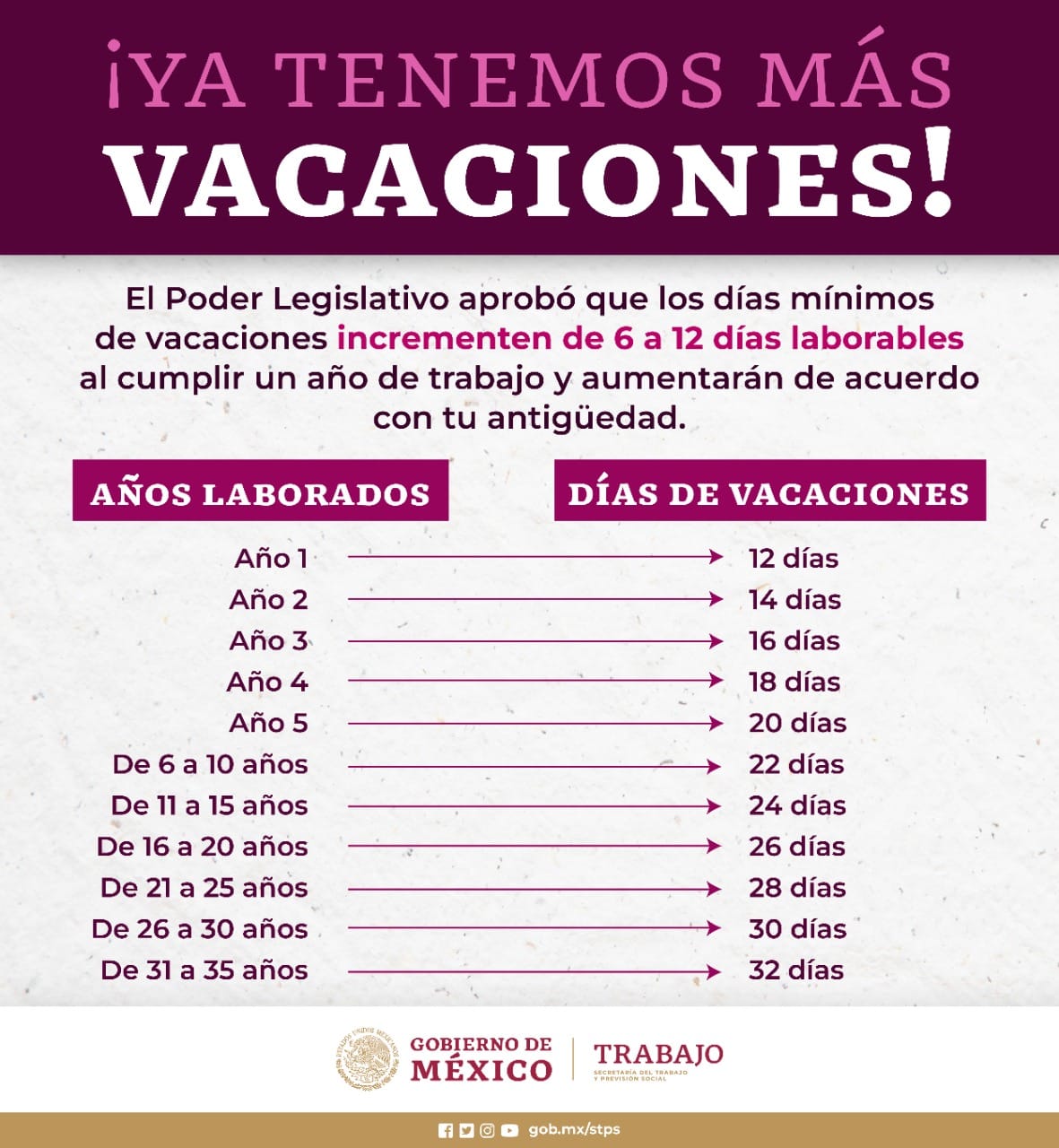Asimismo, a manera de ejemplo, el trabajador, que tenga de 20 a 24 años de antigüedad, contará con 26 días de vacaciones al año, en lugar de los 20 que disfruta actualmente, y en el caso de 30 a 34 años de labores, el empleado tendrá 30 días de asueto anuales, en lugar de los 24 actuales.