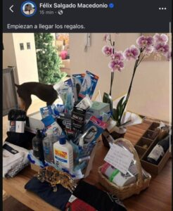 El legislador, quien cumple años este miércoles 14 de enero, publicó una imagen en la que se observaban diversos obsequios entregados por seguidores y amistades, entre ellos un pastel de la organización Perritos Felices, un kit de higiene personal, vino, ropa interior y un decantador con forma de toro.