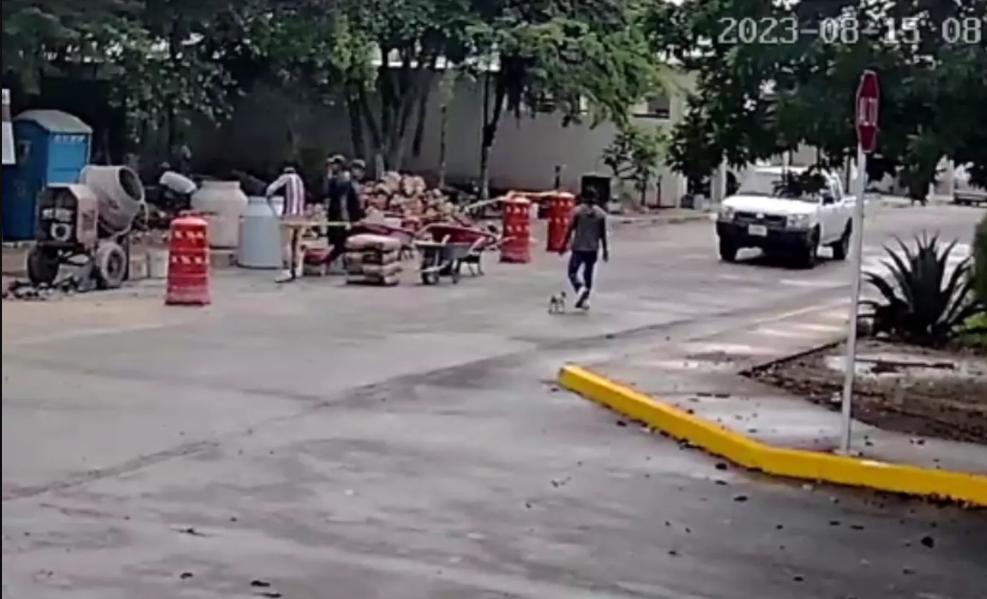 En las imágenes se puede ver cómo una camioneta blanca, presuntamente del hermano del tesorero, avanza a velocidad cerca de una esquina, mientras un albañil trata de cruzar la calle con el perrito a su lado y el vehículo apenas se detiene a unos centímetros de los pies del trabajador.