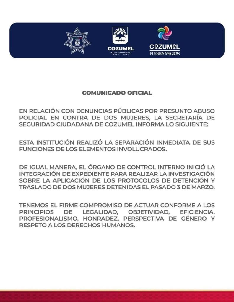 Finalmente, la Secretaría de Seguridad Ciudadana de Cozumel reiteró en un comunicado su compromiso de actuar bajo los principios de legalidad, objetividad, eficiencia, profesionalismo y honradez, además de garantizar el respeto a los derechos humanos y la perspectiva de género durante las actuaciones policiales.