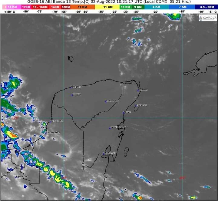 1.- Vaguada térmica (canal de baja presión) localizada en superficie sobre la porción sur del Golfo de México, sin movimiento aparente, en su amplia circulación periférica continúa impulsando aire marítimo tropical con variable contenido de humedad del Golfo de México y mar Caribe hacia la región peninsular; provoca la permanencia de temperaturas muy calurosas a bochornosas durante el día y parte de la noche, cielo medio nublado a nublado; se registrarán lluvias dispersas con chubascos acompañados de actividad eléctrica aislada sobre algunas zonas del estado de Quintana Roo, durante el día y parte de la noche.