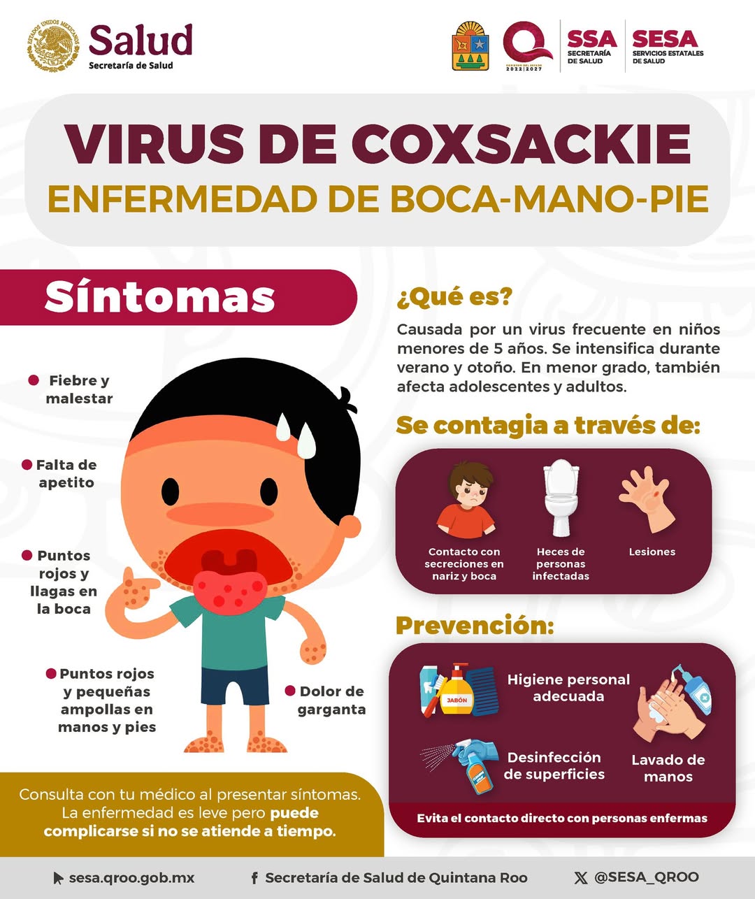 La Secretaría de Salud de Quintana Roo (SESA) emitió una alerta preventiva ante la presencia de casos del virus Coxsackie, causante de la enfermedad conocida como “manos, pies y boca”, que afecta principalmente a niños menores de cinco años y tiene mayor incidencia durante las temporadas de verano y otoño.
