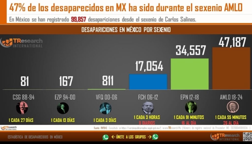 De acuerdo con el estudio de TResearch, 47 por ciento de las desapariciones reportadas en México desde el sexenio de Carlos Salinas de Gortari, se han registrado durante el gobierno de Andrés Manuel López Obrador.