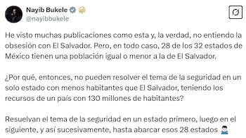 “28 de los 32 estados de México tienen una población igual o menor a la de El Salvador. ¿Por qué, entonces, no pueden resolver el tema de la seguridad en un solo estado con menos habitantes que El Salvador, teniendo los recursos de un país con 130 millones de habitantes?”, posteó Bukele.