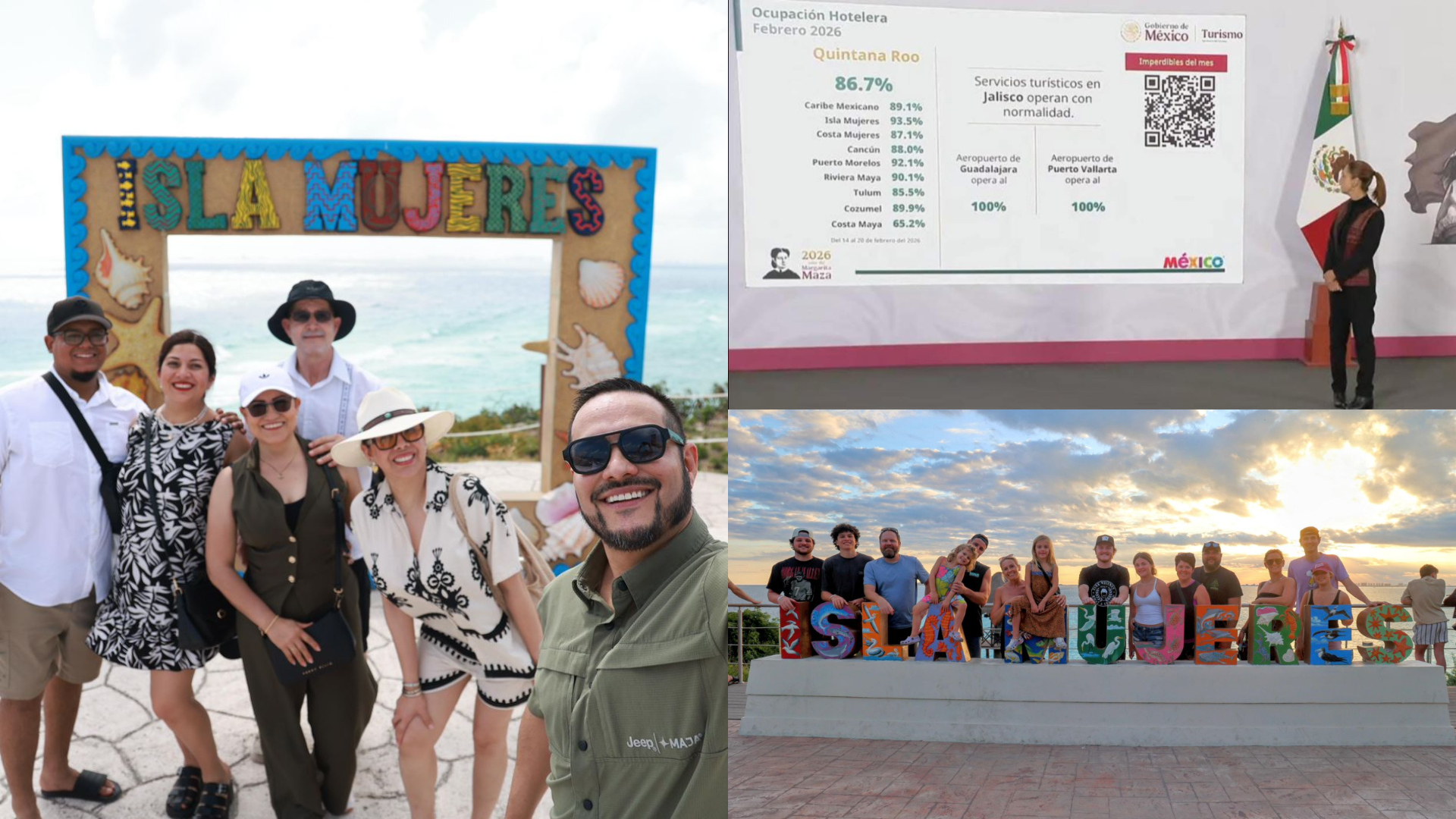 Isla Mujeres (Marcrix Noticias).– Durante la conferencia matutina del Gobierno de México, encabezada por la Presidenta de la República, Claudia Sheinbaum Pardo, la Secretaría de Turismo de México (Sectur), dio a conocer los indicadores de ocupación hotelera correspondientes a febrero de 2026, en los que Isla Mujeres se posiciona como el destino con mayor ocupación de todo Quintana Roo, al registrar un 93.5 por ciento.