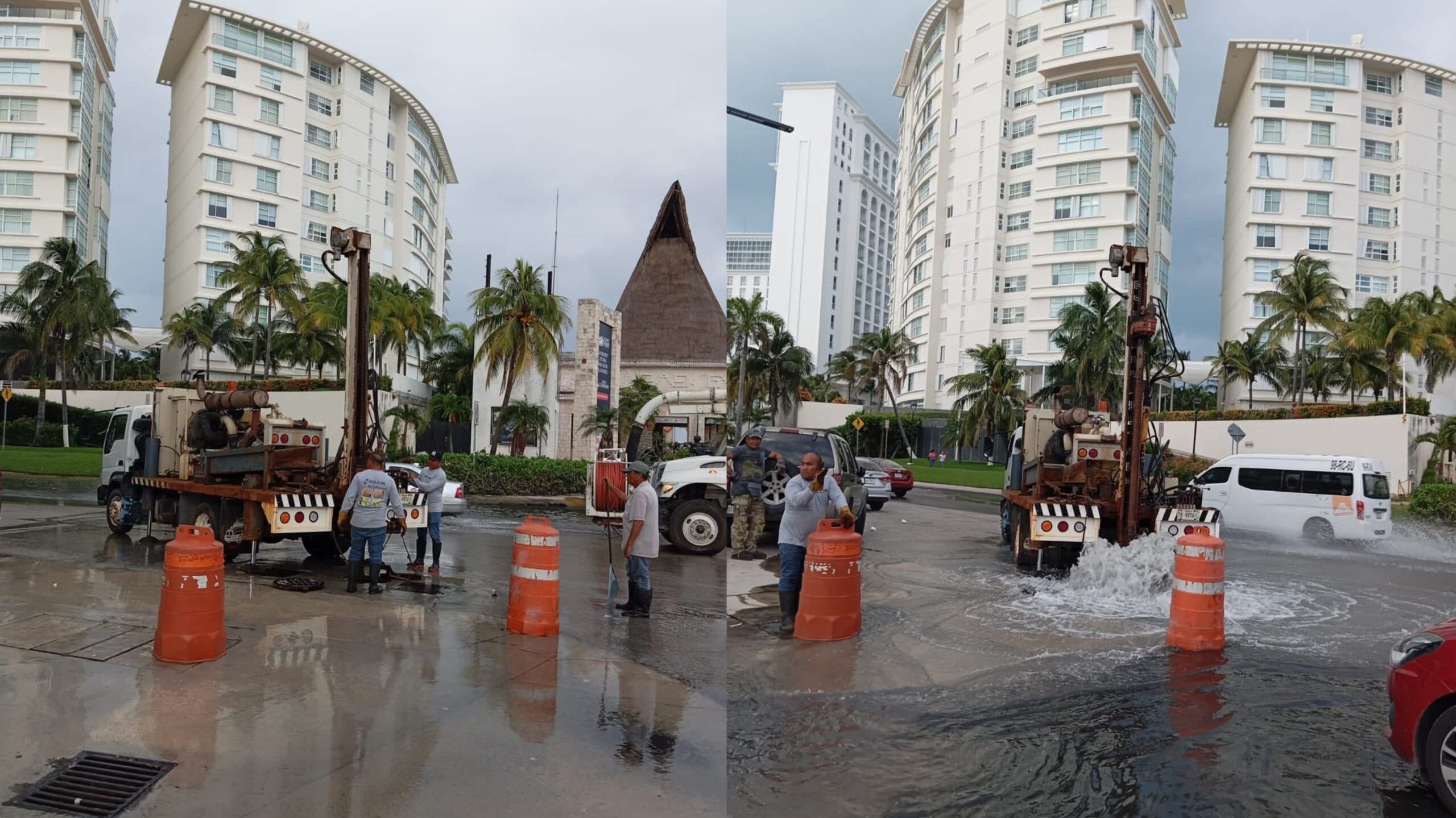 En el caso del desazolve, personal técnico atiende pozos y ductos pluviales que presentaban acumulación de sedimentos. Esta acción busca prevenir encharcamientos en puntos donde se han registrado afectaciones durante precipitaciones, especialmente en accesos a zonas comerciales y hoteleras.