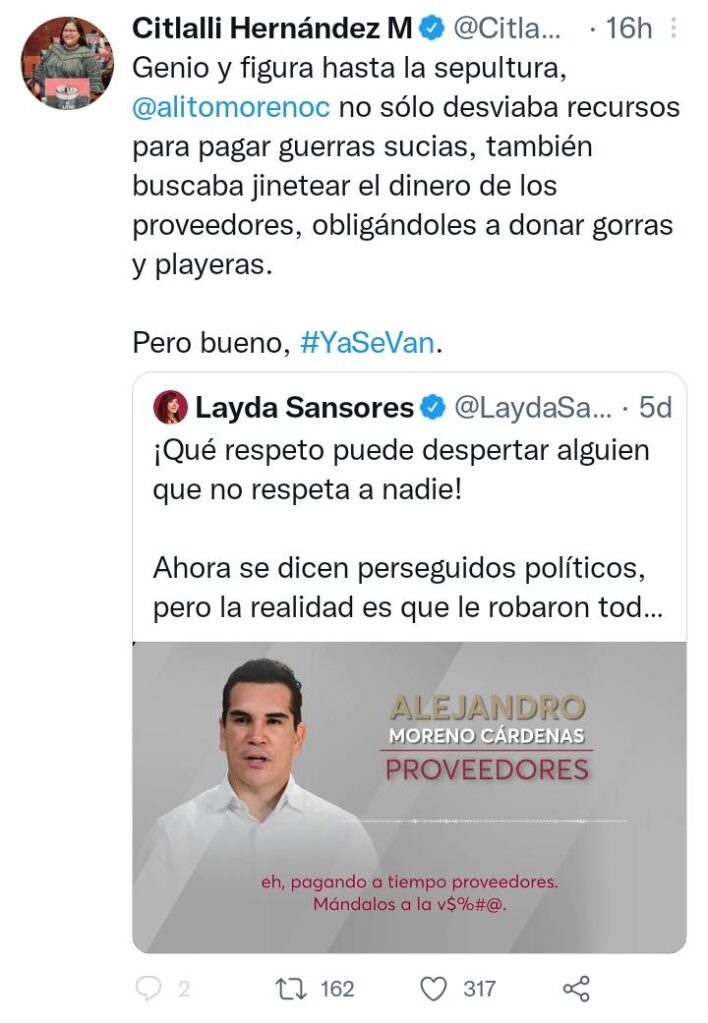 “Genio y figura hasta la sepultura, @alitomoreno no sólo desviaba recursos para pagar guerras sucias, también buscaba jinetear el dinero de los proveedores, obligándoles a donar gorras y playeras. Pero bueno, #YaSeVan”, redacto ayer lunes 16 de mayo.