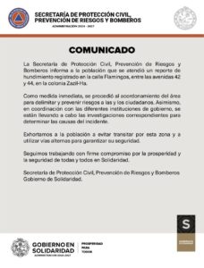 Por su parte La Secretaría de Protección Civil, Prevención de Riesgos y Bomberos emitió un comunicado en el se refiere, que el reporte de hundimiento registrado en la calle Flamingos, entre las avenidas 42 y 44, en la colonia Zazil-Ha, fue atendido en tiempo y forma.