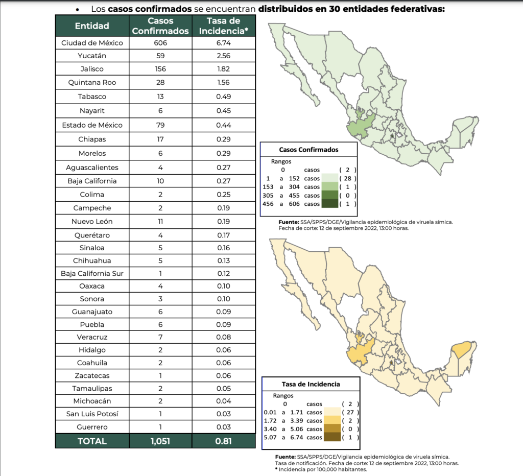 Ciudad de México (Marcrix Noticias).- La Secretaría de Salud informó que, hasta este lunes 12 de septiembre, en México se han confirmado mil 51 casos de viruela del mono.