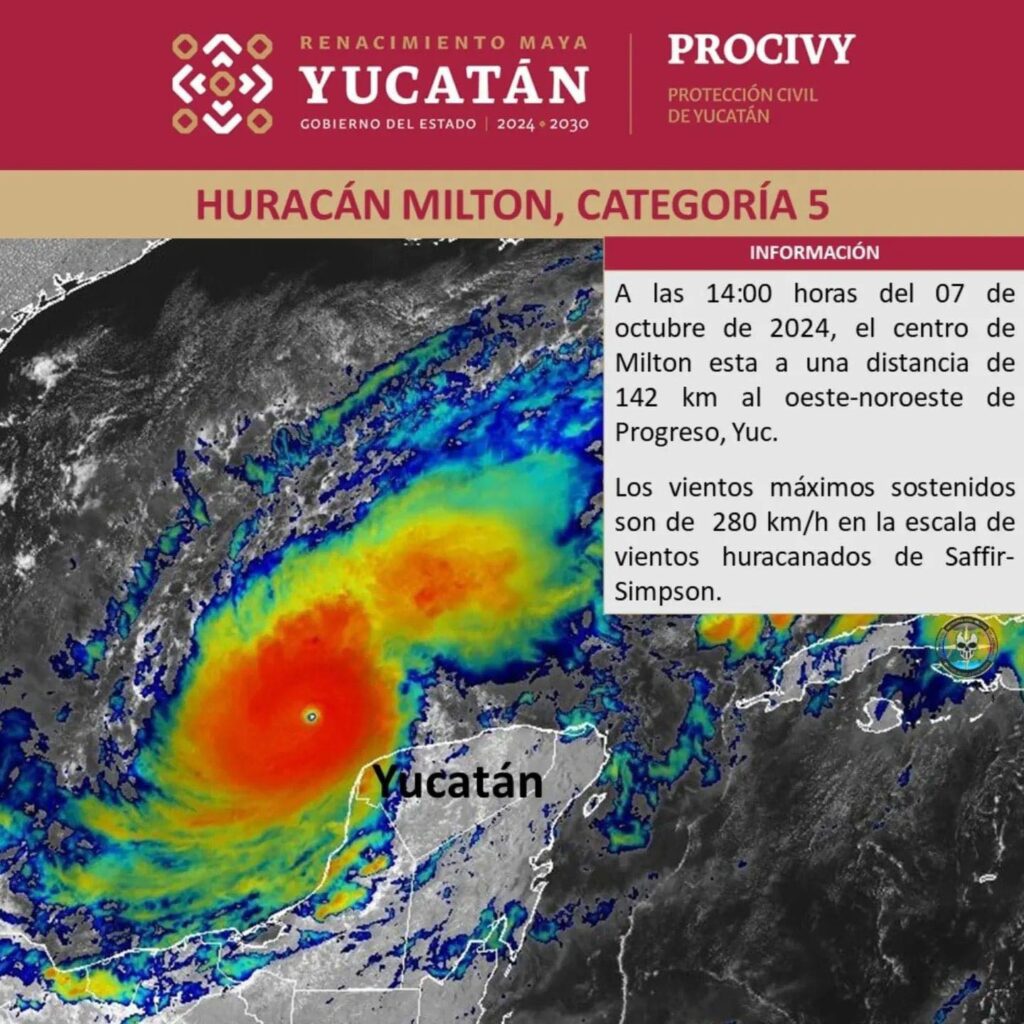 Puerto Progreso (Marcrix Noticias).- Autoridades de Yucatán emitieron una Alerta Roja para 69 municipios de la entidad ante el acercamiento del huracán de ‘Milton’ en las costas, que ya es categoría 5 en la escala Saffir-Simpson.