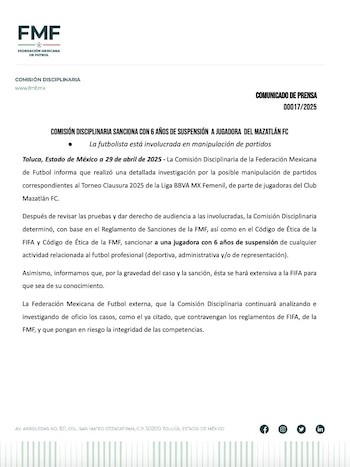 El comunicado publicado por la FMF indica que después de revisar las pruebas y dar derechos de audiencia a las involucradas, la Comisión Disciplinaria determinó, con base en el Reglamento de Sanciones de la FMF, así como en el Código de Ética de la FIFA y Código de Ética de la FMF, sancionar a una jugadora con seis años de suspensión de cualquier actividad relacionada al futbol profesional (deportiva, administrativa y/o representación)”.